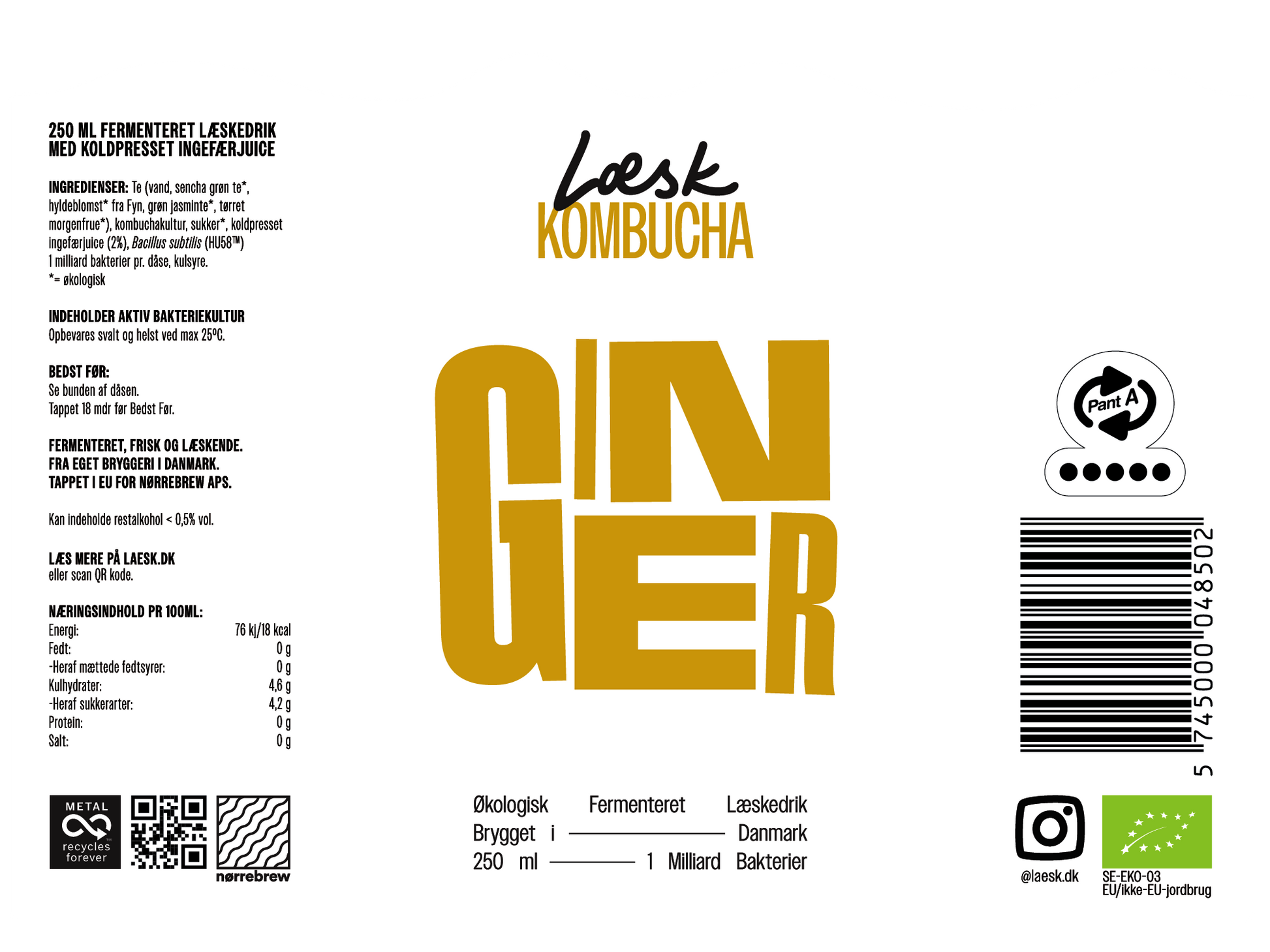 Læsk Kombucha brygges med økologisk grøn te, sukker og en symbiotisk kultur af bakterier og gær (også kendt som en SCOBY). Blandingen fermenteres traditionelt i 10–14 dage, hvor størstedelen af sukkeret omdannes til organiske syrer og komplekse smagsnuancer. Efter fermenteringen blander vi den med friske, kvalitetsjuicer og infusioner – lige inden den tappes på dåse.
